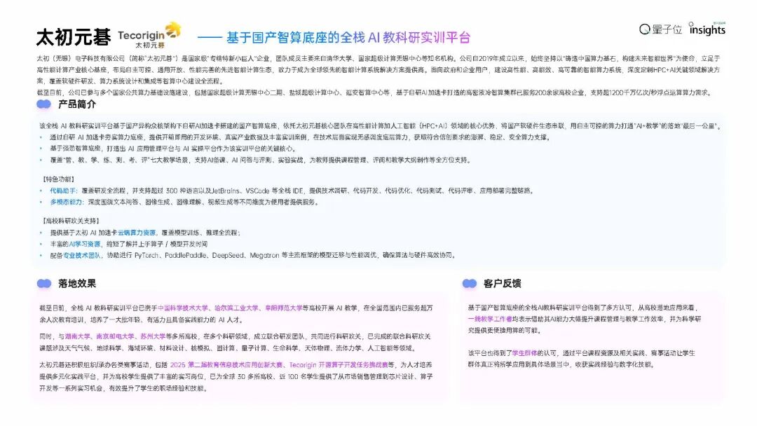 在該報告中,太初元碁基于國產(chǎn)智算底座的全棧AI教科研實訓(xùn)平臺,憑借其在AI基礎(chǔ)設(shè)施與教育科研深度融合方面的創(chuàng)新實踐,被列為產(chǎn)業(yè)代表案例。此次入選,體現(xiàn)了業(yè)界對太初在國產(chǎn)化算力建設(shè)與AI人才培育體系中發(fā)揮的支撐作用的認可。