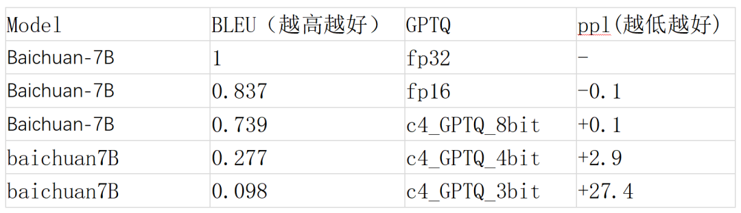 GPTQ是PTQ中的一種方案,下表給出了我們基于開源的Baichuan-7B模型進(jìn)行模型量化之后的效果。